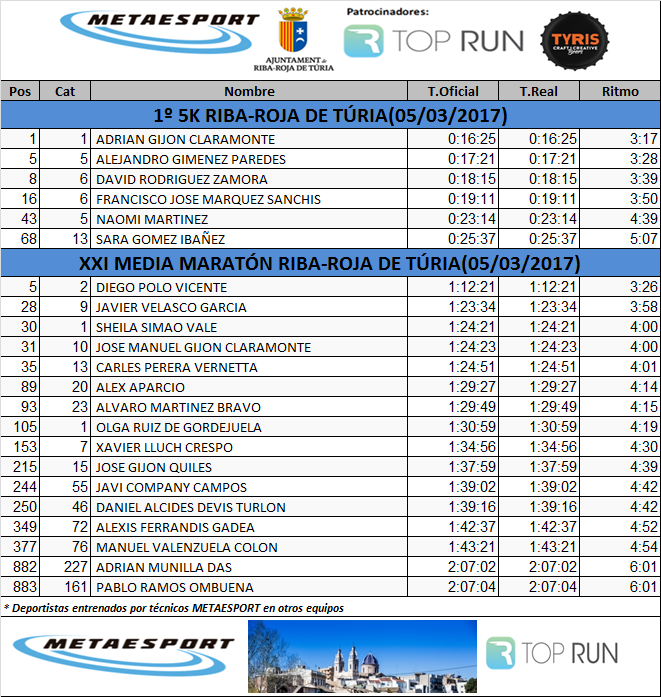 Resultados conjuntos tanto de la 5K como de la MM del CD Metaesport de Riba-roja de Túria. Nos falta en el cuadro Jose DelasHeras que disputó la prueba del 5K.