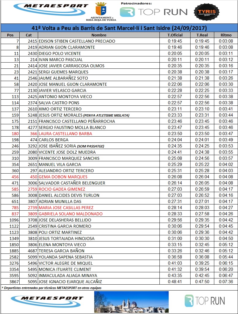 Las chicas, nuevamente a las puertas del pódium pero orgullosos por: 1) La reaparición de Olga Ruiz; 2) Los 4 segundos que mejora su promedio Laura Castellano con respecto a la prueba anterior; 3) Por ver un promedio por debajo de 4:00/km para Gema Dobón; 4) Por la aportación de Naomí; 5) Por la mejora de 6-7 segundo de Mariajo y Gabriela.
